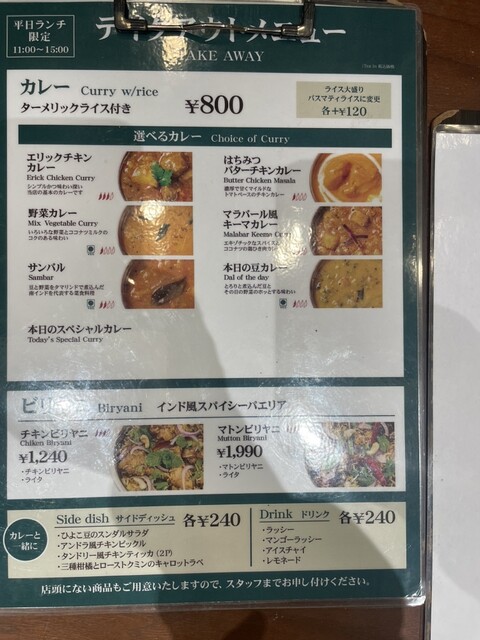 先週のビリヤニに続き来店。今回はエリックチキンカレー。