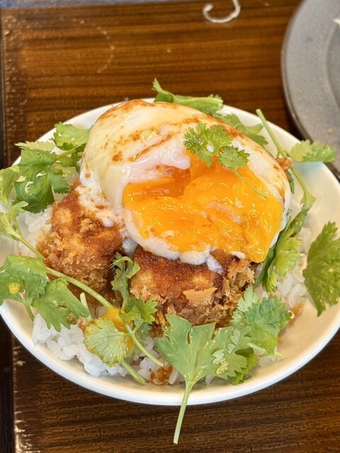 さらに、ご飯の上にとんかつ・にんにく醤油ダレ・温玉・パクチーをのせて“即席かつ丼”にすると、これがまた最高でした。