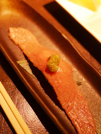 次の「山形牛にぎり一貫」にも、このナポリ産のお塩をぱらり。