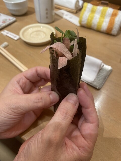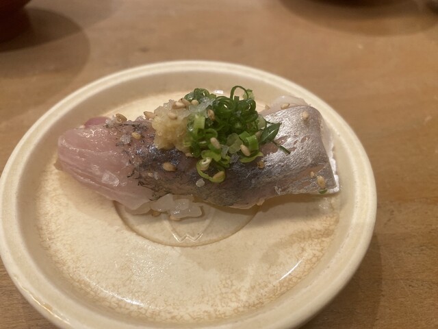 昼の予約。平貝のおつまみ、鮪、鯛、鯵、烏賊、大トロ、穴子、赤身、海老、雲丹、鮪の巻物など12品、万膳のロック、生ビール。最もおいしかったのは地元の鯵で過去イチの美味しさ。すべて良かったのでコマネチの10点をあげちゃう。