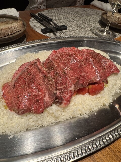 メインの三田牛ランプステーキは、表面は香ばしくクリスピーに焼き上げられ、中はしっとり柔らか。絶妙な火入れで、付け合わせのマスタードとの相性も抜群でした。デザートのチーズケーキは濃厚で、最後まで満足度の高いコース構成。