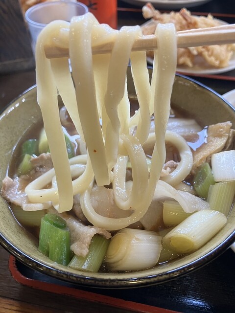 肉汁うどん中盛@1080円は、甘めの醤油出汁に柔らかいネギと大きめの豚バラ肉がたっぷり入っており、うどんの量も普通の店の倍以上ある。この豚肉とネギの相性が抜群に良い。