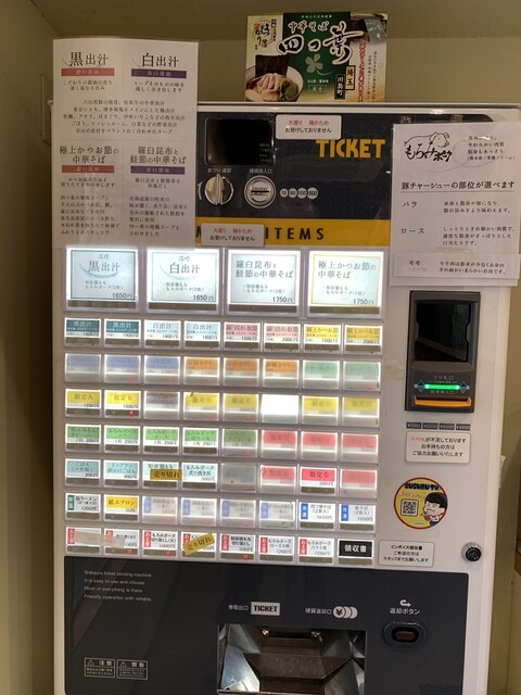 自分は黒出汁、連れは白出汁を注文。この店、焼豚にこだわっていて、知床鶏もも・もろみポーク1枚ついて@1400円、知床鶏もも・もろみポーク2枚だと@1650円、知床鶏もも・もろみポーク3枚で@1900円。さらに豚焼豚は、ロース、バラ、モモから好きに選べる。せっかくだから、異なる部位を選んでみたら、それぞれ個性があって美味しい。醤油出汁の染み込み度合が違うらしい。麺は北海道産小麦を使った自家製麺、醤油は地元の金笛醤油等7種をブレンド、出汁は牛骨、豚骨、丸鶏、貝類や干魚、昆布、野菜で仕込んだスープだそうだ。実のところ健康面で塩分控える身分なのに、黒出汁と言っても塩辛さがなく、醤油味のポトフのような優しい味で、飲み干してしまった。四つ葉とは違って、海鮮の風味がひきたっている気がする。