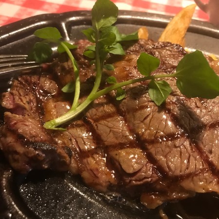 理由は、500グラムだと他のサイドメニュー(こっちもいろいろ味わいたい)が食べられないことと、肉の食感として脂身と赤身のベストミックスは300グラムぐらいかなという感じがします。この二つの理由から、300グラムをミディアムレアで頂くのが僕のお薦め。そしてそのほかにその日その日のスペシャルメニューなどを何品か頼めばいいのではないでしょうか。ちなみに300グラムのステーキだと・・・