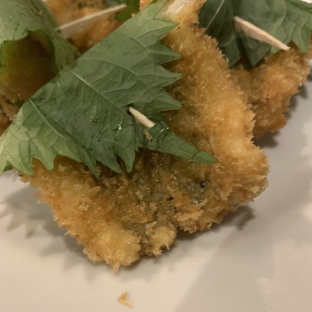 料理は第2ラウンドへ。まずは鱧のカツです。おお振り肉厚の鱧を贅沢に使っています。すだちをジュッと絞っていただきます。鱧もすだちも徳島の名産。大葉のさっぱり感がなんともいいトッピングになって、口の中を楽しませてくれる。熱々のうちにフーフーしながら食べるのがめっちゃ美味しい一品。