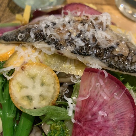 さて料理。まずはサヨリのカルパッチョ。サヨリというと小さい切り身を想像してしまうのですが、今回は違いました。このお皿、直径25センチぐらいありますが、それをはみ出す大きさ。びっくりしました。