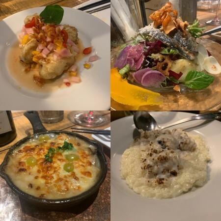 お二人さまの時は、金柑とマスカットのマスカルポーネ白和え、アンコーのフリット、冬野菜のサラダ(通常サイズ)、牡蠣・白菜・帆立のグラタン、最後が白子のリゾットをいただいた。