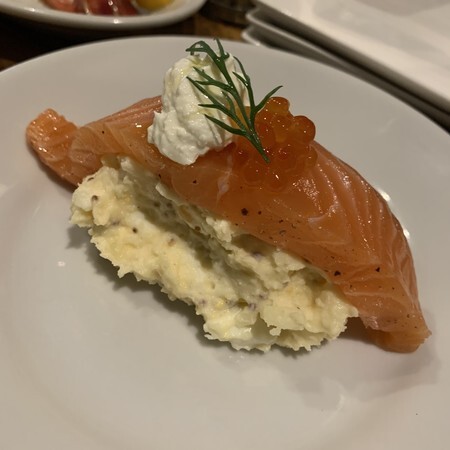 この日の2品目は、サーモンといくらがトッピングされたポテサラです。ポテトとサーモン、いくらを絡めて食べました。ポテトの甘味とサーモンの旨味といくらの味が絡み合って美味しいポテサラでした。
