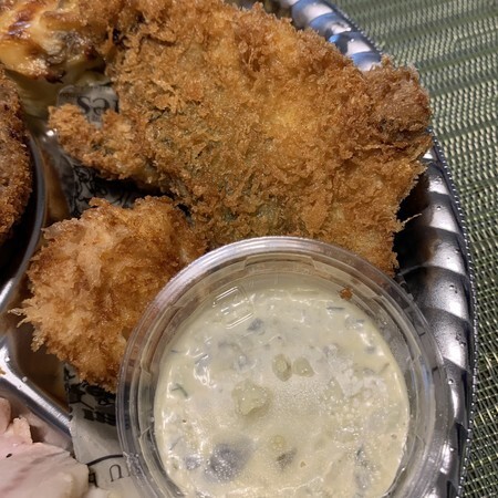 3品目は、カキフライ。タルタルソースが写っていませんが、実は牡蠣の下に隠れています。牡蠣の下に野菜が敷いてあって、その上にタルタルソースがあって、そこにカキフライが載っていると言う・・・こうきたか!って感じの盛り付け。見た通り、カキフライの上にも野菜が散りばめられて美味しいカキフライでした。