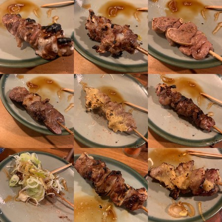 そして焼いてもらう。焼いてもらうのは昔はお任せで焼いていたが、最近はいちいち頼むようにしている。そうしないとメニューを忘れてしまうんだな。ボケ防止にもなるし、一品ずつ頼んで焼いてもらう。こうやって写真で見るとみんな同じ感じに見えるけど、1本1本、みんな違う。当然だ。美味しく個性的なもつ焼きオンパレード。
