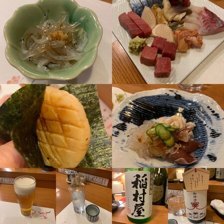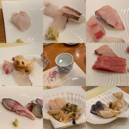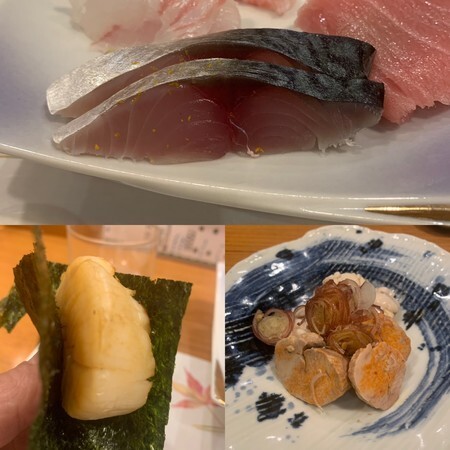 我々はいつものように生ビールから始まり、日本酒を数種類いただきました。そしておつまみ+にぎりのフルコースでお願いします。つまみはしらうおから始まり、刺身の盛り合わせ、焼き物は本日は帆立貝、そして季節の合わせ技でのれそれ、ホタルイカと名残のたらの白子の盛り合わせとまあ、豪華でした。
