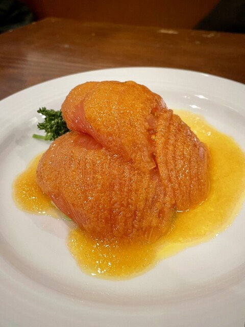 トマト1つで高いな!と思いましたが、湯むきしたトマトは5ミリ程度幅に薄切りされていて、ドレッシングがよく絡んでとても美味しいです。シャッキリ冷やされているのもよいですね。ハーフで頼まなくてよかった。
