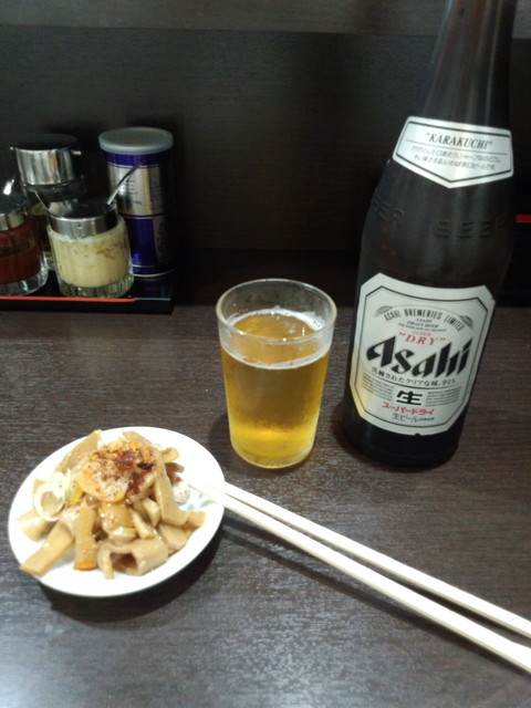 開店50分前に到着、13番目。開店と同時に中に入りラーメン800円とメンマ・チャーシュウ450円、ビール550円を選択。