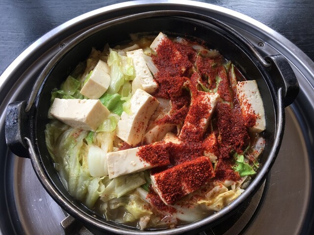そんでもって、山盛りの鍋キャベツがクタクタになるまで煮込んで完成。赤唐辛子のカオスが繋ぐ、モツとキャベツと豆腐の共演です。この鍋の主役はやはりキャベツ。ただでさえ甘いキャベツが唐辛子で更に糖度が増したように感じ、念入りに美味いです。
