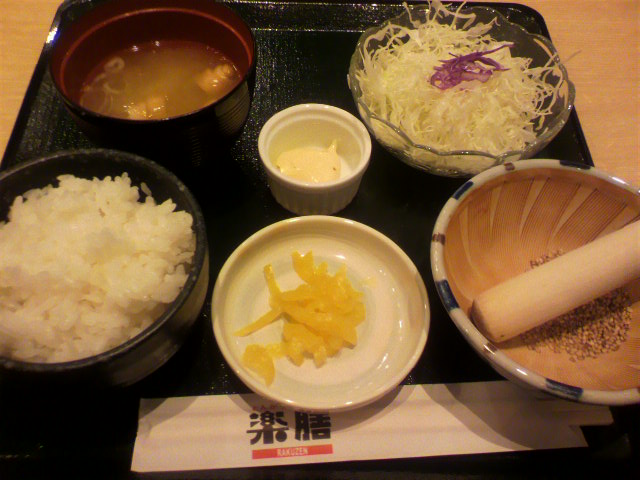 ご飯・味噌汁・キャベツがおかわり自由。