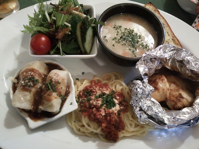 あとはロールキャベツ、パスタ、ガーリックトースト、サラダ。