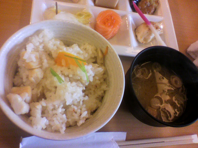 レディース膳のホタテご飯のホタテがたっぷりでした。おかずが多くても完食!いろんな種類が食べられて、唐揚げや魚の西京焼きがあったので満足。