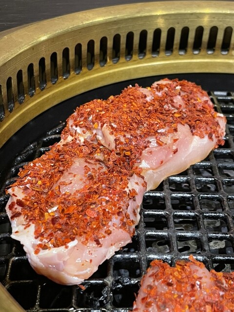 熟成モモ肉に唐辛子のパウダーがコーティングされたやつこれ美味すぎ!見た目ほど辛くなくで