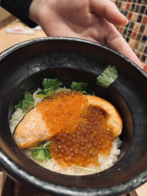 サーモンはらすといくらの土鍋ご飯。食べきれない場合は快くお持ち帰り用にしてくれます
