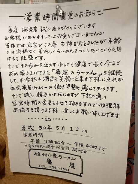 上山田の名店「信州小麦ラーメン亀屋」へ出かけました。