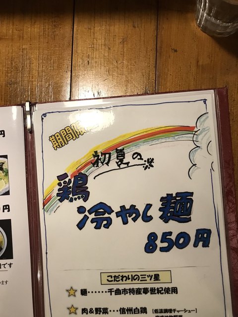 夢つけ麺の大盛りを思い描いて伺ったのですが、なんとメニューに「鶏冷やし麺」が登場していました。