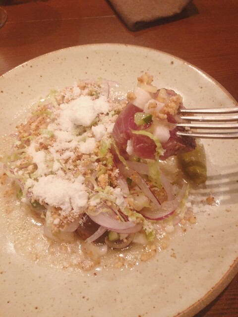 ヤイトカツオは皮目を炙り、たっぷりの野菜と。