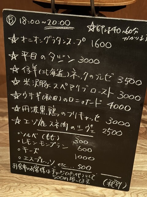 ディナーは5800円 アミューズ4皿、前菜2皿、メイン(デザート、ドリンク別)