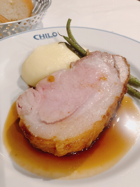 主菜は「沖縄産アグー豚の炭火焼きロースト」大きな塊で じっくり炭火焼きにした皮付きの豚。シットリと焼かれた柔らかな赤身に、トロける脂身。