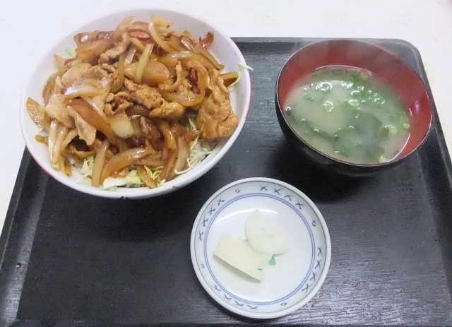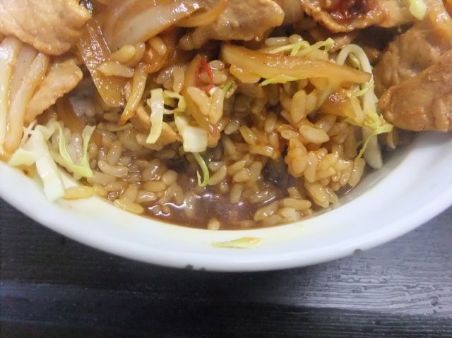 豚肉にタマネギ、ご飯の上には生のキャベツが見えます。