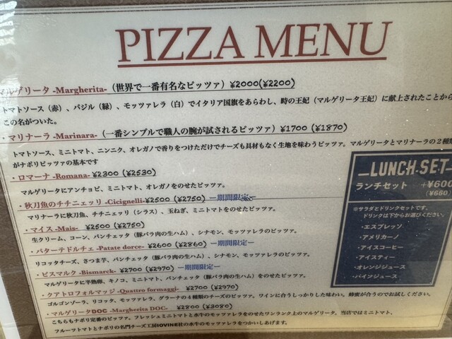 DOCとクワトロフロンチオの2枚を頼みました。トマトソースがとても味が濃くおいしかったです。またモッツァレラもいい感じでトロトロでおいしかったです。