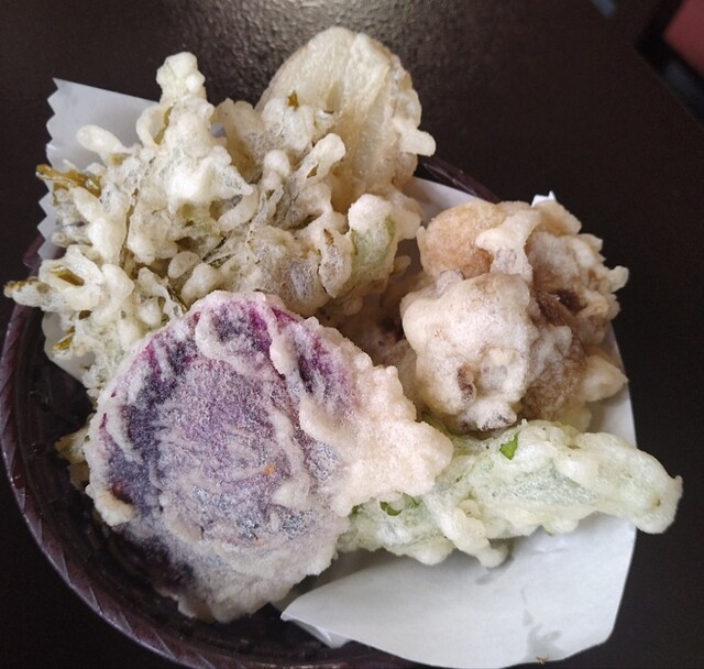 わさび菜、舞茸、きくいも等の天ぷらでほのかに塩味がついていてそのままいただけます。