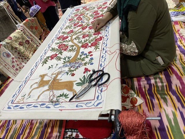 スザニは絹で刺繍される作品で、図柄はザクロやブドウなどの植物。