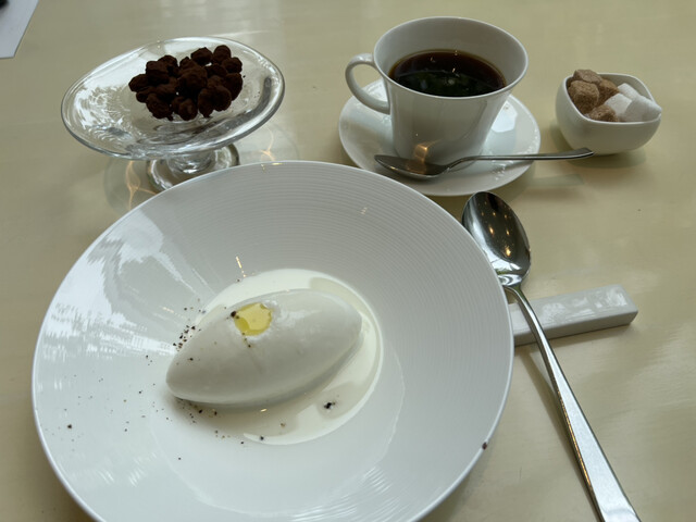 デザートの牛乳ソルベには、オリーブオイル、お好みで黒胡椒と言われ、半分だけとワガママオーダー(^^;)