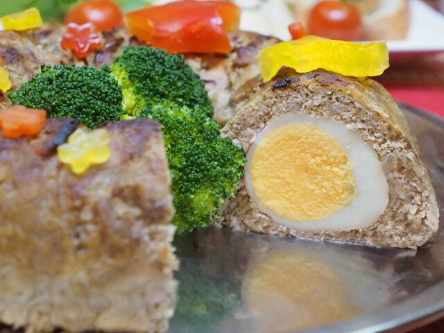 ミートローフはゆでたまご入りに。生地にはたまねぎ、