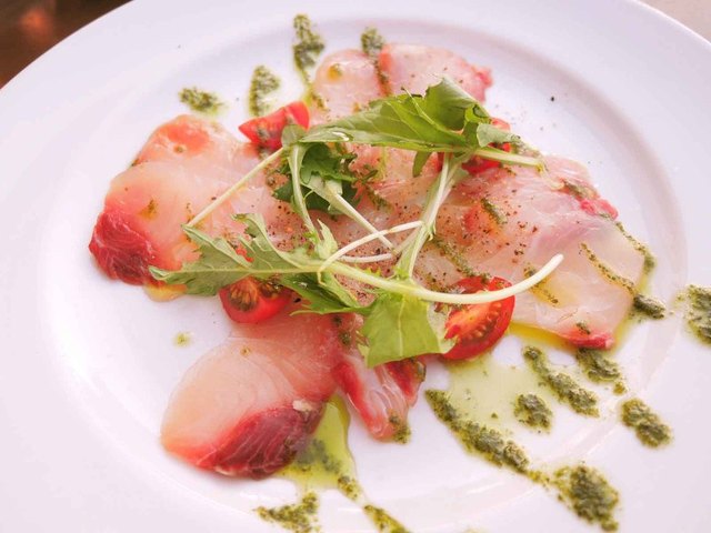 2つ目の前菜、鮮魚のカルパッチョバジル風味。