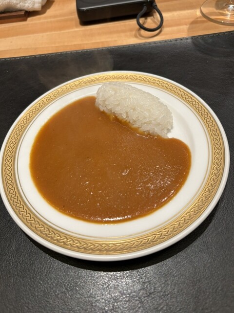 オマール海老の炊き込みご飯 : オマール海老の出汁で炊かれたご飯。 さらに出汁は煮詰めて生クリームを少しと海老の尻尾と炭火で焼いたものと絡めてトップに。 爪の部分はフライにしてサイドに。 さらにボタンエビの頭から出汁をとってスープにして上からかけて
