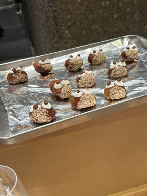 フォアグラとイチゴのもなか: 中には、あまおうのコンフィチュール、キリッシュのゼリー、セルフィーユ、栃乙女、 アーモンドの砂糖がけなど入っていて、見た目以上に複雑な味わい。