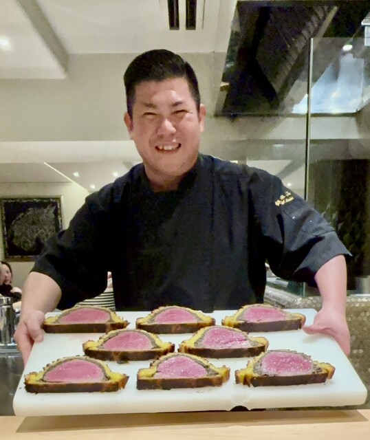 魚はカツオに比べれば優しい味わいのメジマグロ。これを藁焼きしてたたきをする所は和の調理ですが、焦がし玉ねぎのソースや、黒ニンニクを散らして味わいはフレンチとなっているところは流石です。
