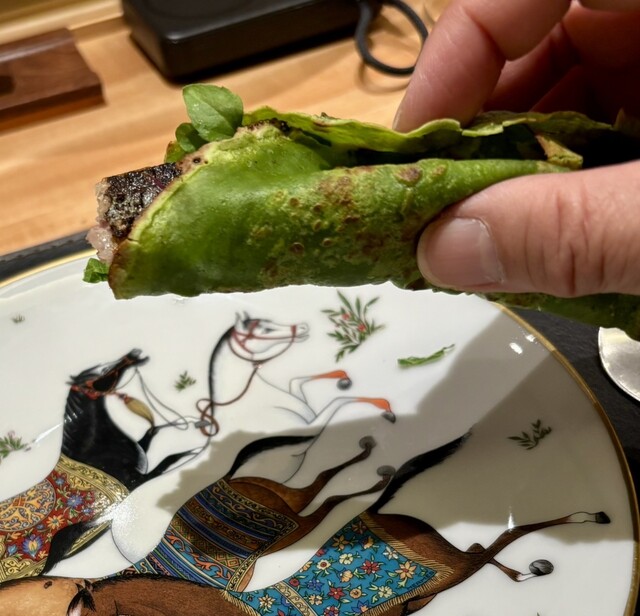 この日も定番料理と新しい料理のコンビネーションでしたが、最初に感動したのは秋刀魚のクレープ包み。秋刀魚のクセは控えめで見事に洋風料理になってます。厚みのあるクレープも日本人には嬉しいかと。