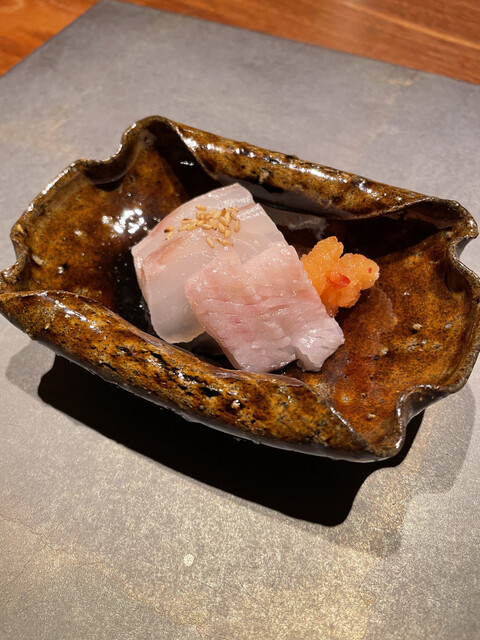 山口のグジ、間に蕪の甘漬け。お酢と鰹節のジュレを