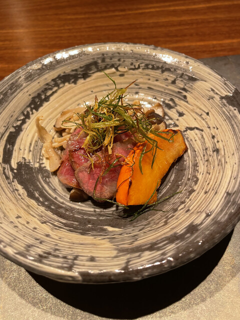 ▫️椀盛り: 黒毛和牛のイチボ すき焼き風 茨城県産のいちぼをローストしてすき焼き風に。 奥に、九条ネギ、雪うるい; 手前に、京ニンジンとヒラタケ 上にカリフローレ、黒七味をかけて