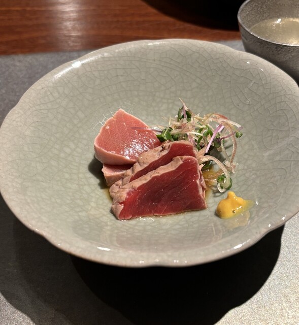 淡路の鰹。季節の定番の鰹たたきも行者ニンニクのソースで、一味違います