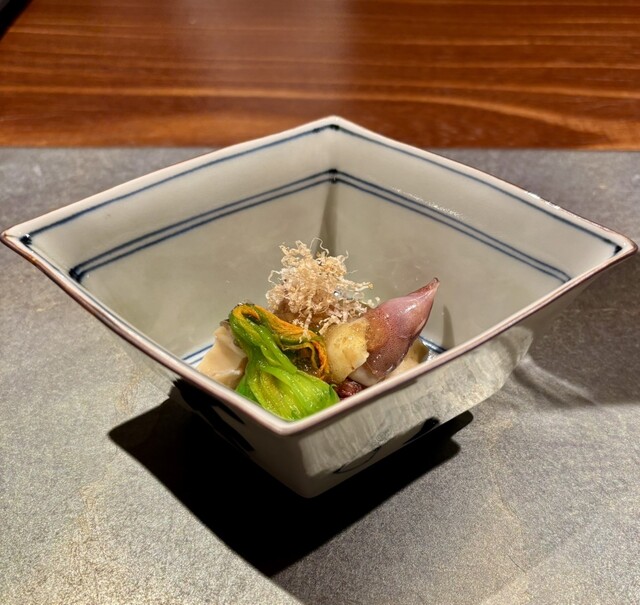 ▫️ ホタルイカ、花ズッキーニ、黒鮑のジュレがけ