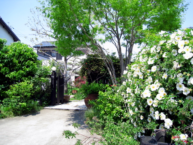 入口には大きなモッコウバラやナニワイバラが咲き乱れ、