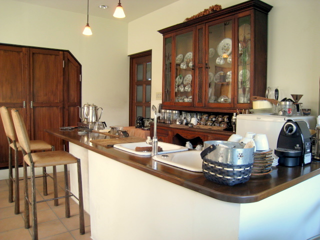 明るいオープンキッチン、重厚な食器棚が白壁に存在感バッチリ