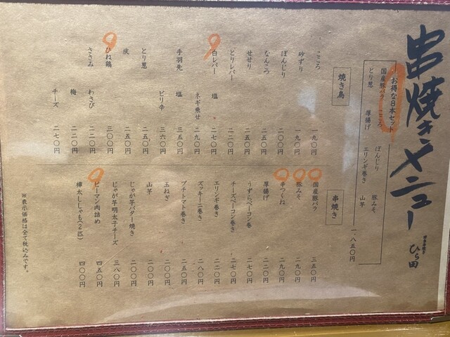 (豚バラ・こころ・ぼんじり・豚味噌・とり葱・厚揚げ・エリンギ巻き・山芋)