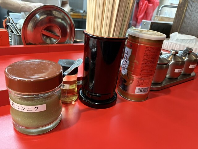 中盤で、塩分がやや辛くなってきたので、卓上のおろしショウガを多めに投入して味変を楽しむことにした。スープが強いので多めのショウガでも決して負ける事はない。