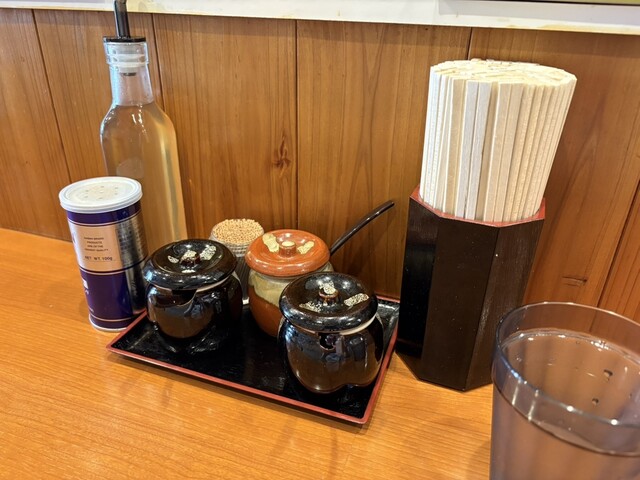 ラーメン(900)と海苔(5枚200)を購入し硬め注文。厨房の様子を拝見すると麺の通い箱はプラ製で麻生製麺の文字が見える。大寸胴は2本、麺の茹でも大寸胴にテボを入れる方式で最大で6杯ほど茹でられそうだ。オペレーションは2人態勢で、ストレスのない待ち時間で提供された。