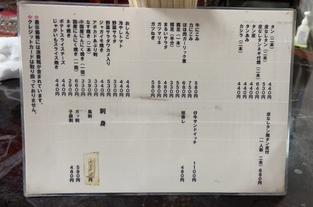 周りとの違和感を感じるぐらい歴史を感じる外観。もう渋過ぎる。この見た目で予約が取れないと言われたらもう絶対に旨いやん。壁のメニュー表も年季が入って雰囲気抜群。気になるメニューばかり並んでますが、このお店は初回のオーダーで全て食べたいメニューを頼みきった方が良いと思われます。その理由は・・・、大将がお一人で捌きまくります。捌きまくる上に喋りまくる。こういった下町の人気店は店員さんがめちゃくちゃ強い店が少なくないと感じておりますが、大将がめちゃくちゃフレンドリーです。根っからのいい人だと思います。