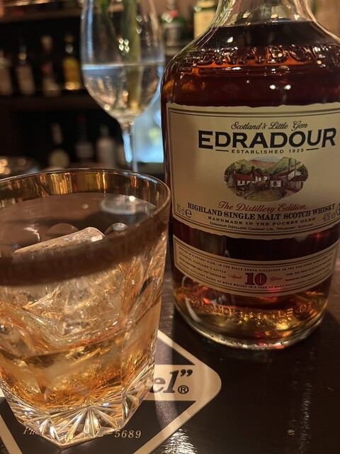 カウンターに座りマスターと対峙。とにかくマスターのオススメのウイスキーの一杯をいただく。EDRADOUR。そしてここのマスターの腕前!を知ることに。今まで見たことがない氷のカット!なんと8面体にカットされたは見ても良し、ロックグラスに入れてウイスキーを注ぐときに出る音に酔う。これであっという間にノックアウト。その後井川蒸留所の話しをじっくり聞きながら、少しいただく。